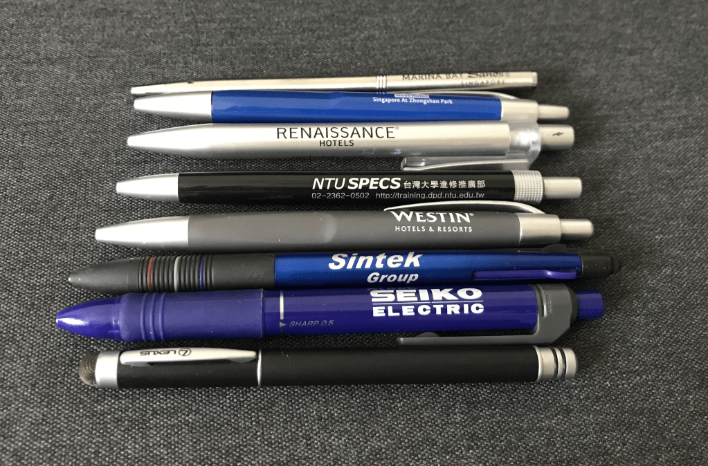 - 過去常拿到飯店、研討會、科技公司所贈送的原子筆。即便再怎麼順手好寫,因為不是自己第一優先想使用的,所以要盡量少拿。