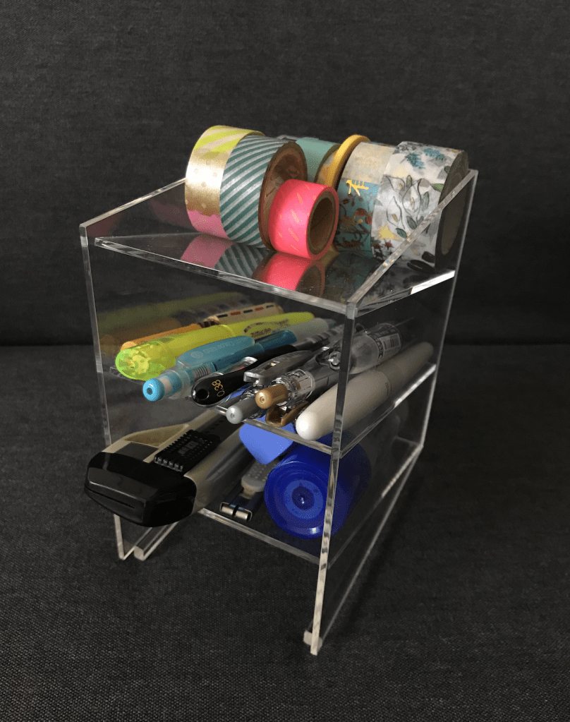 - 特殊狀況才會用的(畫手帳,做卡片,包裝包裹)放在透明盒中收進櫃子裡