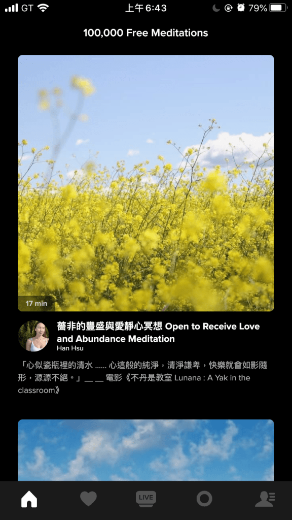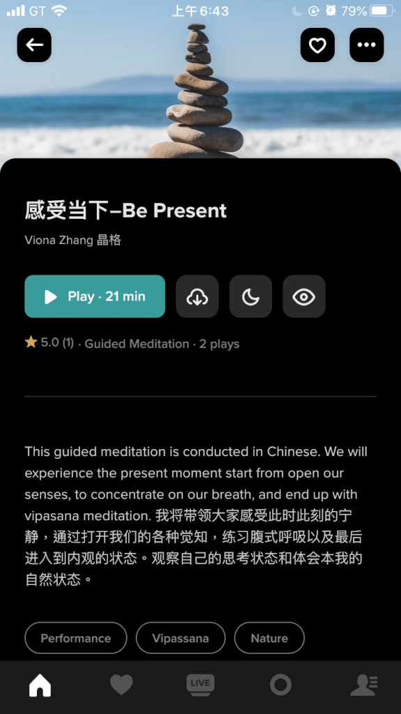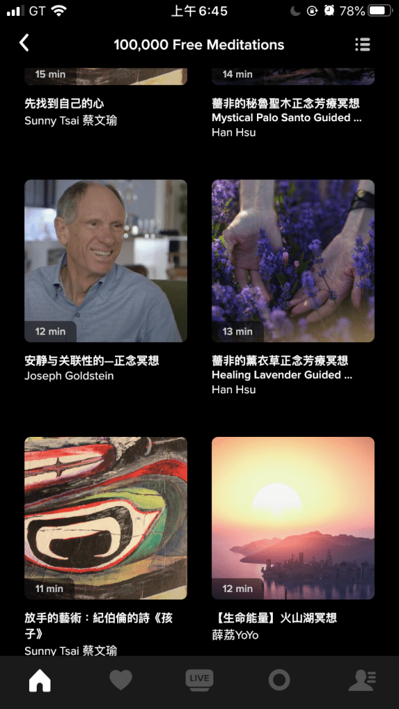 雖然 APP 是以英文為主,免費英文語音引導音頻的資源非常豐富,不過最近中文引導音頻的數量也增加蠻多的。兩者品質都還不錯!英文的語音引導也很能讓人進入狀況。