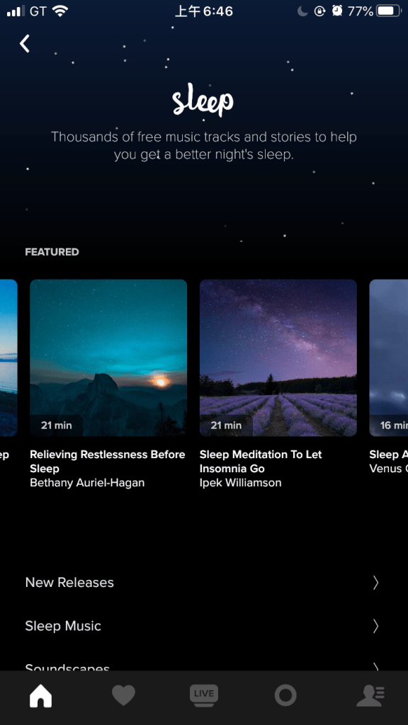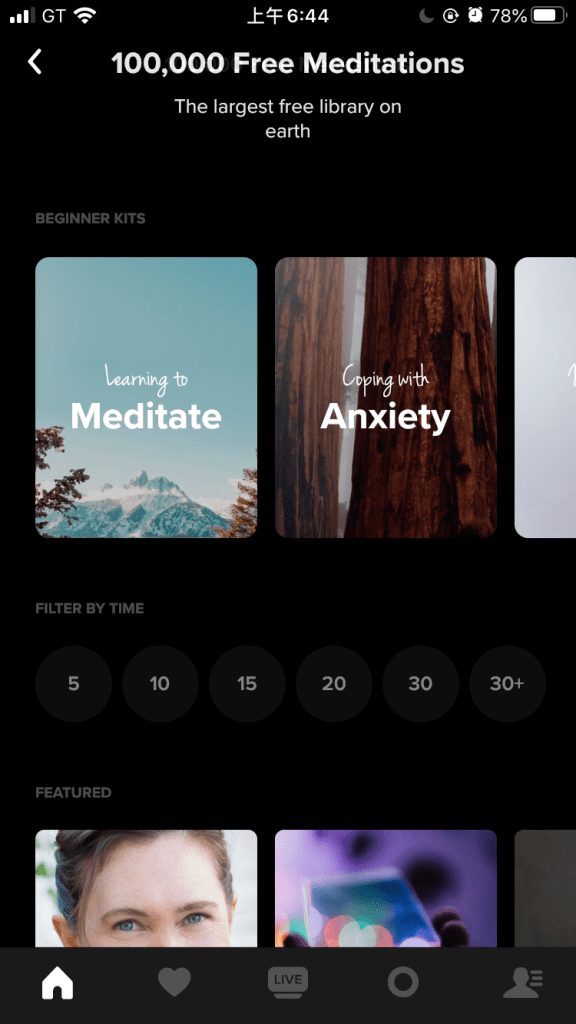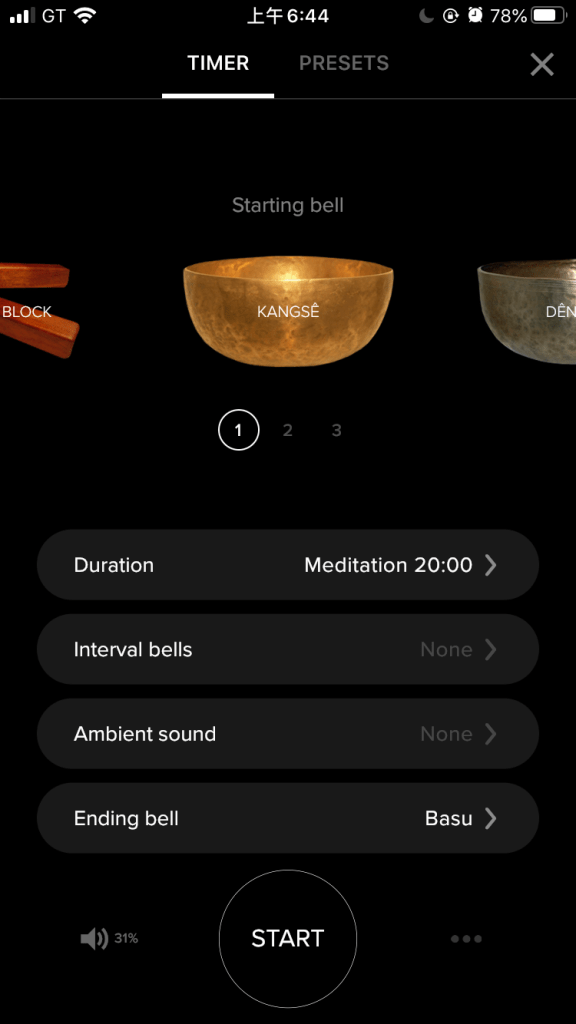 - 依想進行的冥想類型選擇:APP 中提供語音引導、適用於睡眠放鬆或冥想的音樂(大自然的聲音、療癒的音樂.. 等等),甚至,還有單純的缽音的定時器。這個定時器的功能我很喜歡,平常設定手機內建幾分鐘後提醒的鬧鐘時,鐘點一到的提示聲會讓人心情焦慮。但是這個定時器用起來很舒服,很像創造了一個可以專注處理某件事情的時空的感覺,不論是冥想或者是專注工作時都很好用。