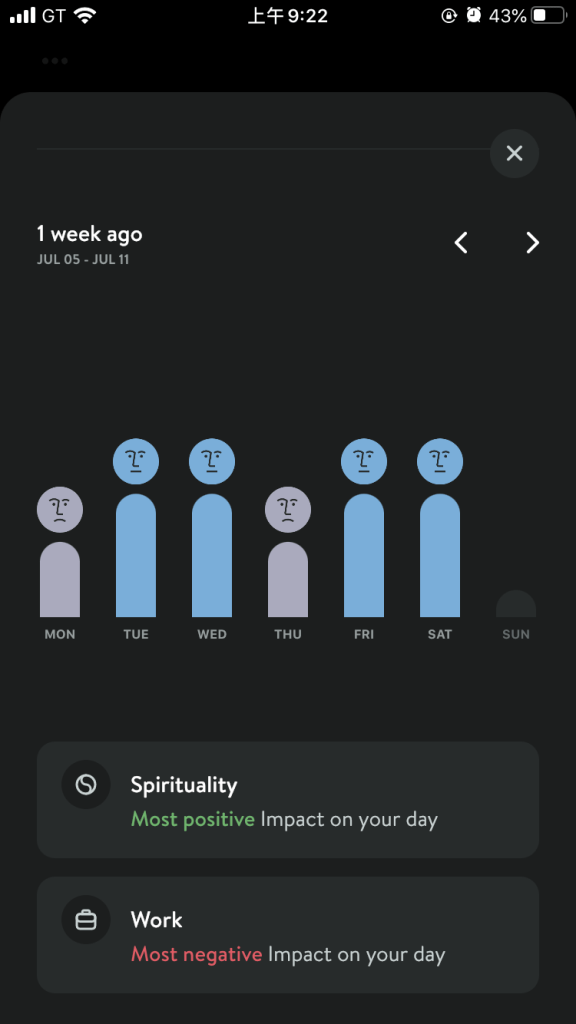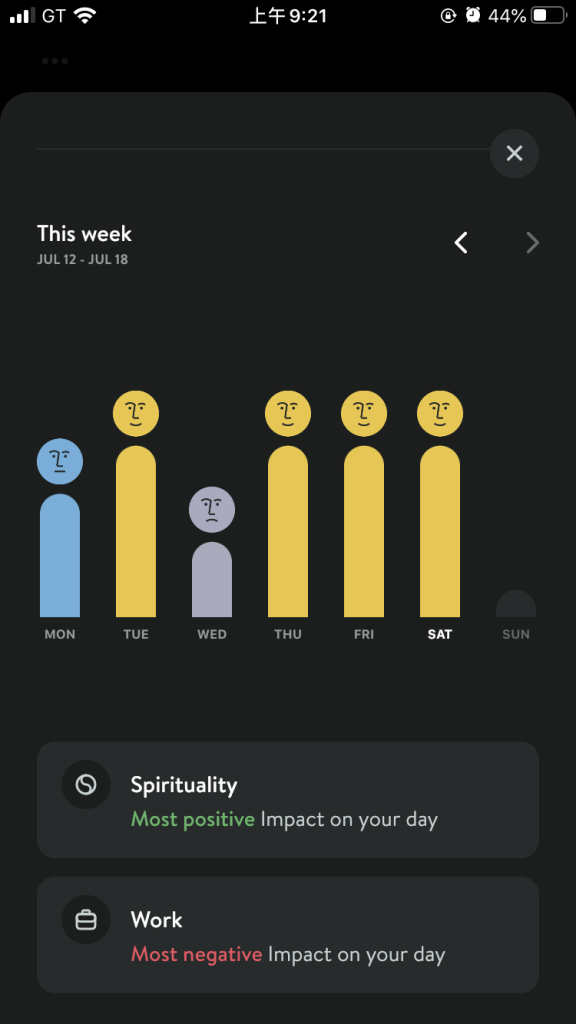 前幾天,意外發現 APP 中有情緒追蹤的功能。往前查看自己的過往紀錄,才驚訝地意識到原來讓我心情變好的是身心靈活動,讓我心情不好的主要是職場工作呢 😆