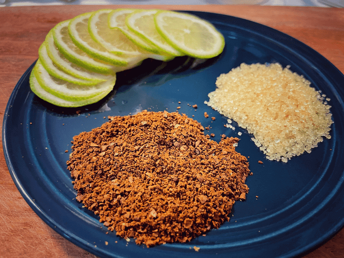 去年,先生的家人聚會辦在一家特別的無菜單料理店,在我們吃飽喝足後,很有個性的老闆神秘的端出一道特別的點心。盤子上的元素很簡單——只有新鮮檸檬片、現磨咖啡粉、淡紅棕色糖粒。